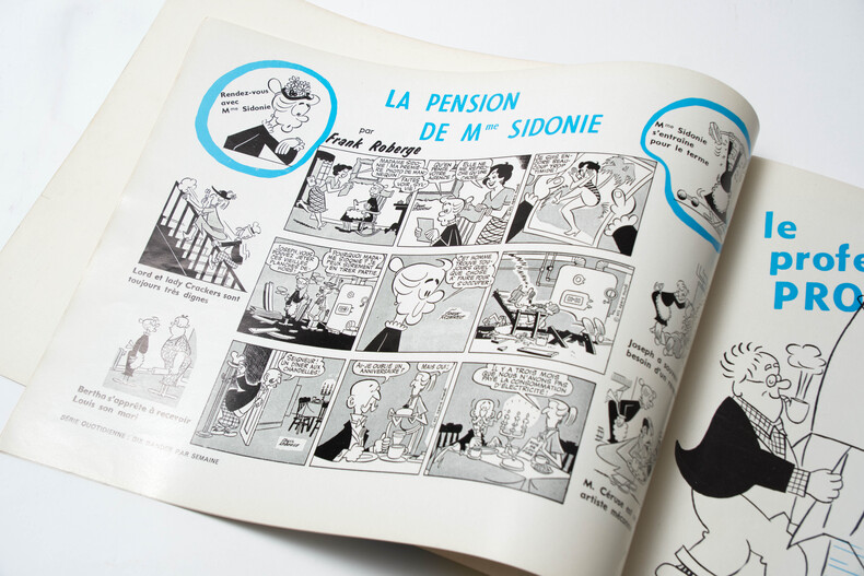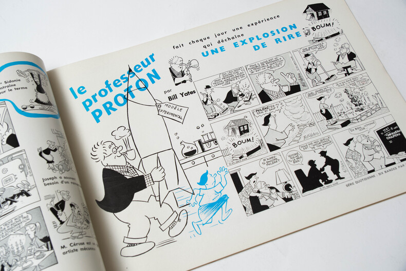 Editions Opera Mundi / KFS ( King Features Syndicate ), sans date ( années 1950/60 ). In-4 broché a l'italienne, non paginé, au format 37 x 27 cm. Couverture avec titre. Dos toilé bordeaux. Livre publicitaire présentant les séries déssinées KFS, traduites en plus de 30 langues dans 100 pays et publiés dans plus de 500 journaux. Tirage sur couché. Reproductions en noir de planches en strip dont : Blondie par Chic Young, La Famille Illico par Vern Greene, M.Abernaty par Ralston Jones et Frank Ridgeway, Hippolyte et Clémentine par Mark Walter et Dik Brownen, Popeye par Tom Sims, Mme Sidonie par Frank Roberge, La Famille Flop par Swan, Henry par Carl Anderson, Félix le Chat par Joe Oriolo, Myrtille par Dudley Fisher, Beetle Bailey par Mort Walker, Nestor le futé par Burnett Crandall, Pim Pam Poum par Joe Musial, Le Petit Roi par O.Soglow, Le Colonel Duchesse par Chic Young, Les nouvelles Eves par Don Flowers, Juliette de mon coeur par Stan Drake, Rip Kirby par John Prentice, Guy l'Eclair par Dan Barry et Mac Raboy, Agent Secret X9 par Bob Lewis, Johnny Hazard par Frank Robbins, Luc Bradefer par Paul Norris, Le Fantôme par Lee Falk et Wilson McCoy, Mandrake par Lee Falk et Phil Davis, Steve Canyon par Milton Caniff, Prince Valiant par Hal Foster, Mickey, Donald, Scawp, etc par les studios Walt Diney. Superbe état général. Très rare édition originale en petit tirage hors commerce.