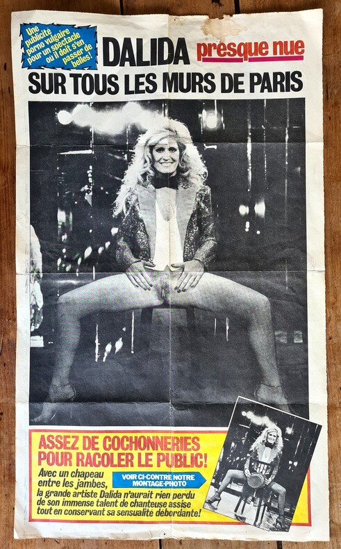 Mini poster érotique de intitulé Dalida, presque nue, sur tous les murs de Paris, au format 35,5 x 30 cm, extrait du Charlie Hebdo n° 478 du 9 janvier 1980. Photo-montage en noir et blanc de la revue Hara Kiri avec au verso une bande dessinée en couleurs de Willem, intitulée : Le passage du nord. Drame théologique en neuf épisodes, partie 4. Tache et petit manque en haut du poster. Petit trou de punaise en haut et en bas de la photo. Le poster a été plié. Etat général correct. Rare édition originale. Ce poster fut censuré et déclencha un procès auprès des tribunaux contre le journal.