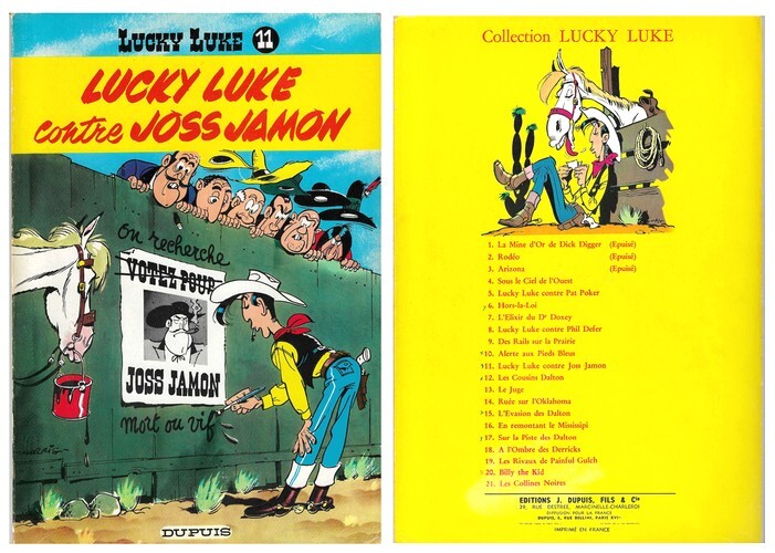 Editions Dupuis / Lucky Luke n° 11 de 1964. In-4 broché de 48 pages au format 30 x 20,5 cm. Couverture illustrée. Dos carré muet. Plats et intérieur frais. 4ème plat jaune comportant la liste des titres parus, dont le dernier annoncé est " Les Collines Noires ", avec 6 croix devant 6 titres. Dessins en couleurs et scénario de Morris. Deuxième édition grand format. Rare surtout dans un tel état de fraicheur, proche du parfait.
