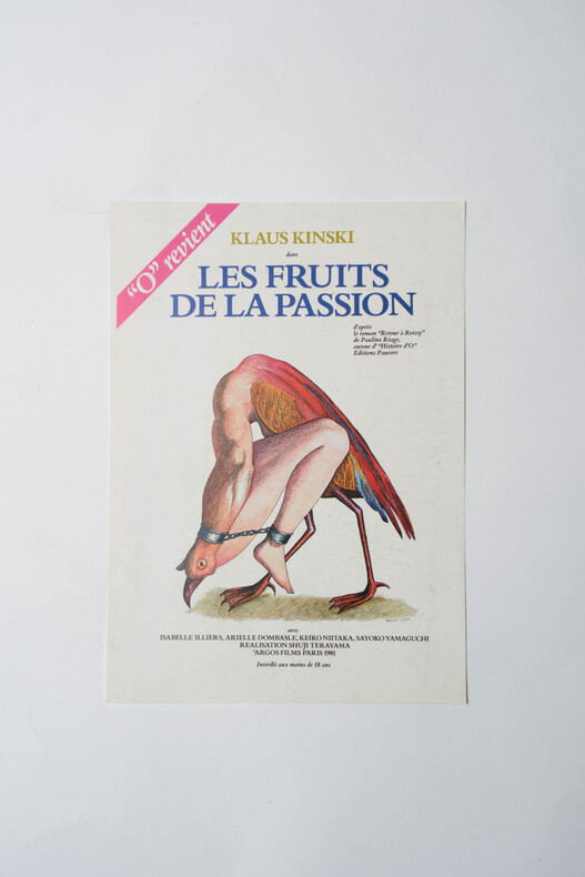 France, Argos Film, Paris 1981. Superbe affichette originale, d'exploitation en salles, illustrée par Roland Topor, pour le film franco-japonais " Les fruits de la passion " réalisé par Sh ji Terayama. Format 28,5 x 20,5 cm. Le film est librement inspiré du roman " Retour à Roissy " de pauline Réage, suite de " Histoire d’O ". On retrouve les personnages principaux des romans Histoire d’O et Retour à Roissy. Sir Stephen et O, sont placés dans le sud de la Chine où Sir Stephen possède un casino. Sir Stephen place O dans un bordel chinois pour sa " formation " et O subit alors diverses expériences humiliantes pour prouver son obéissance inconditionnelle. Une intrigue secondaire concerne une rébellion locale due au ressentiment de la population locale envers les Européens .On trouve dans les rôles principaux : Isabelle Illiers, Klaus Kinski, Arielle Dombasle, Keiko Niitaka, Sayoko Yamaguchi, etc. Superbe état de fraicheur. Rare.