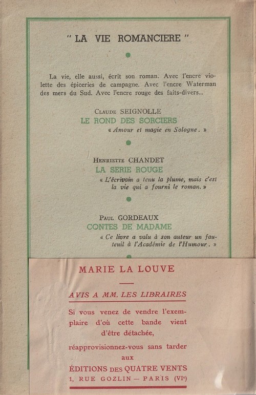 Editions des 4 vents / Collection " La Vie Romancière " 1947. In-12 broché de 292 pages au format 12 x 18,5 cm. Couverture décorée. Dos resté carré. Plats et intérieur frais, exemplaire non coupé. Complet de la rare bande annonce. Rare édition originale, surtout dans un tel état de fraicheur, proche du parfait.