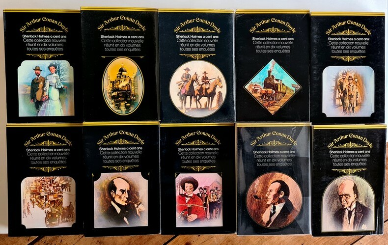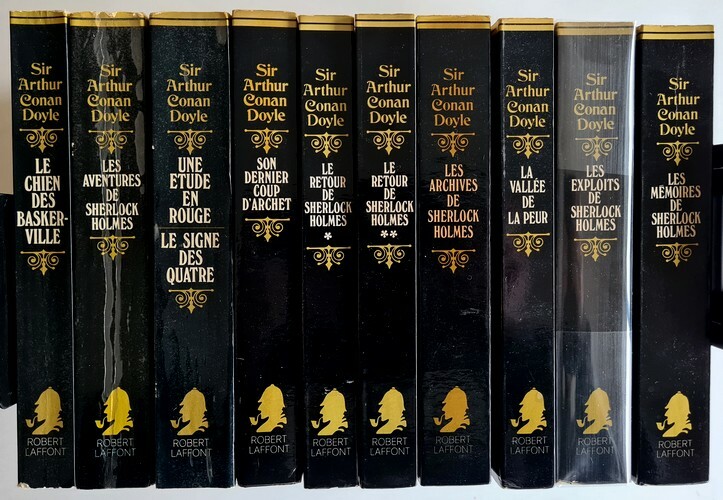 Editions Robert Laffont 1975. Dix volumes in-12 brochés de 199, 345, 282, 228, 203, 212, 282, 201, 300 et 286 pages au format 18 x 12 cm. Superbes couvertures illustrées à rabats par Leigh Taylor. Dos carré avec petites plissures deu pelliculage au tome 2. Plats et intérieur frais. Cette collection éditée pour les 100 ans de Sherlock Holmes, réunit en 10 volumes toutes ses enquêtes : Le Chien des Baskerville - Les Aventures de Sherlock Holmes - Une Etude en Rouge + Le Signe des quatre - Son dernier coup d'archet - Le Retour de Sherlock Holmes ( 2 volumes ) - Les Archives de Sherlock Holmes - La Vallée de la peur - Les Exploits de Sherlock Holmes - Les Mémoires de Sherlock Holmes. A noter que le tome 9 contient 12 excellents pastiches dûs à la plume de John Dickson Carr et d'Adrian Conan Doyle ( fils de Sir Arthur Conan Doyle ). Rare édition originale complète chez l'éditeur et surtout dans un tel état de fraicheur, proche du parfait.