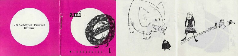 Editions Jean-Jacques Pauvert / Collection " Micrologies 1 " n° 1 de 1959. In-16 agrafé de 20 pages au format 6,5 x 6,5 cm. Couverture illustrée. Recueil de dessins en noir de Ami, non légendées, Plats et intérieur frais. Très bel état général. Rare édition originale.
