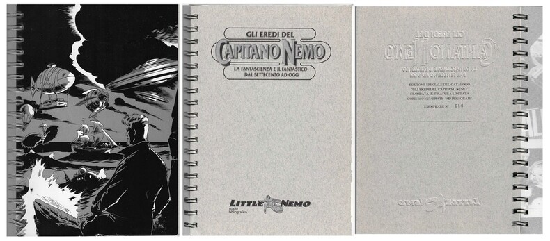 Itale, Torino, Little Nemo, studio bibliografico 1993. In-8 reliure à spirales de 140 pages au format 24 x 16,5 cm. Couvertures en métal. Le 1er plat est illustré par Dante Bastianoni. Plats et intérieur frais. Cet ouvrage, écrit par Sergio Pignatone, est un catalogue de vente présentant 1027 livres, objets, photographies et documents, consacré au fantastiques et à la science-fiction publiés en Italie jusqu’en 2011. Nombreuses illustrations. Un des 150 exemplaires numérotés, ( n° 014 ) avec couverture illustré sur métal, illustrée. Rarissime édition originale en état de neuf.