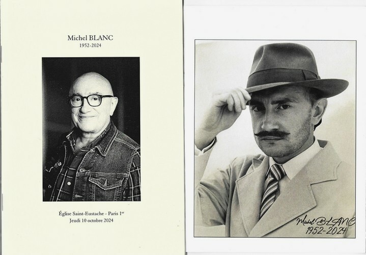 Double plaquette in-8 agrafée de 12 pages. Couverture avec photographie de Michel Blanc. Livret commémoratif qui décrit les événements du service religieux qui eut lieu à l'Eglise Saint-Eustache à Paris, le 10 octobre 2024. Livret intérieur avec photographies en noir de Michel Blanc, accompagnées de quelques un de ses plus fameux dialogues de film. Etat de neuf. Tirage confidentiel pour les proches. Rarissime