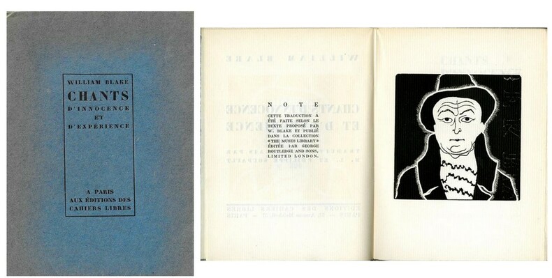 Paris, Editions des Cahiers Libres 1927. In-8 broché de 88 pages au format 20 x 14,5 cm. Couverture rempliée avec titre imprimé. Dos carré avec petit tassement en haut. Comme toujours pour les livres de cette collection, le dos et les bords sont très, très légèrement insolés, sinon plats et intérieur frais. Exemplaire non coupé. Superbe portrait de William Blake en frontispice. Recueil de poèmes de William Blake traduits par M.L. et Philippe Soupault. Tirage unique à 300 exemplaires numérotés sur Hollande ( n° 38 ), après 10 sur Japon du tirage de tête. Rare édition originale en état superbe.