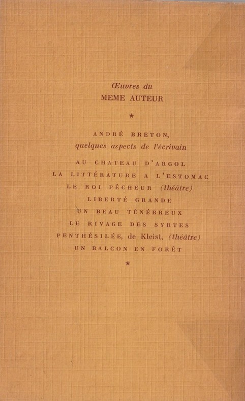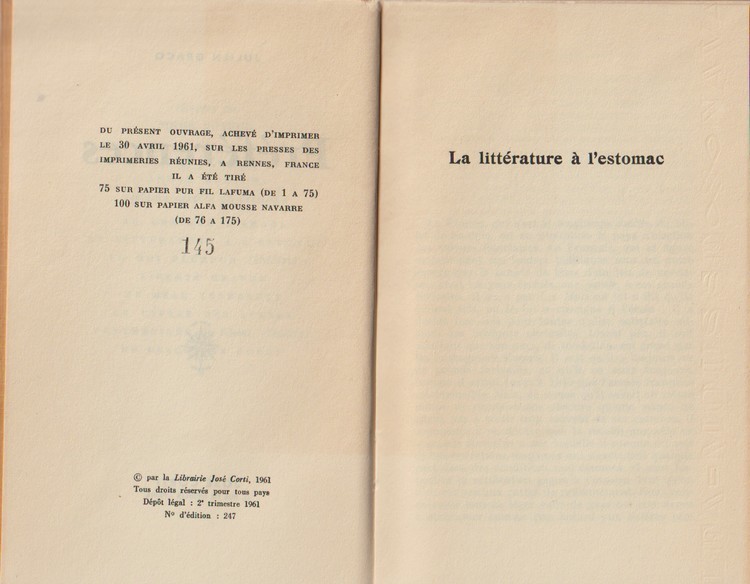 Editions José Corti 1961. In-12 broché de 252 pages au format 12 x 18,5 cm. Couverture avec titre imprimé. Dos bien carré, légèrement insolé, comme les plats. Intérieur parfait et plats frais. Exemplaire non coupé. Un des 100 exemplaires numérotés sur alfa mousse Navarre ( n° 145 ), seul grand papier après 75 sur pur fil. Réunion de textes écrits entre 1946 et 1960. Rare édition originale en superbe état, proche du parfait.