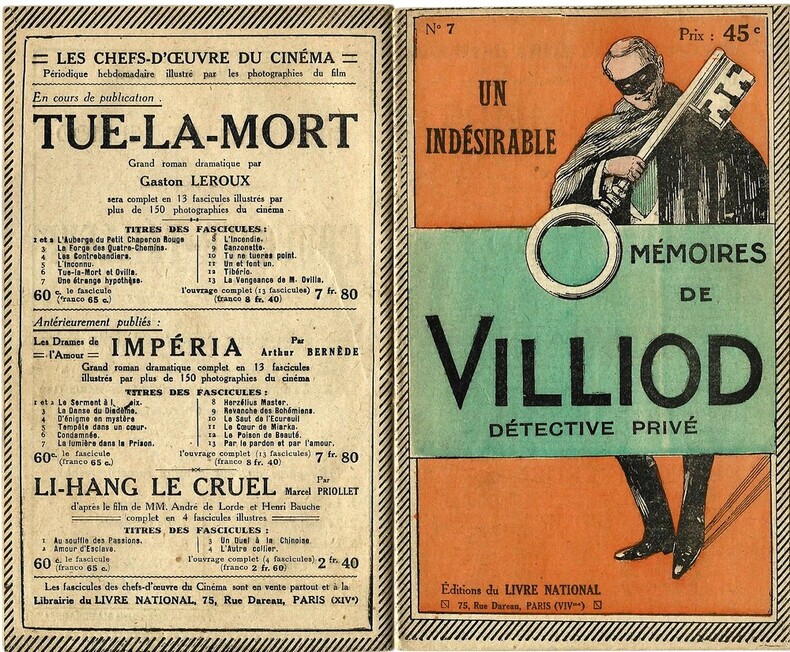 Editions du Livre National 1921. Petit in 12 broché de 28 pages au format 18 x 11 cm. Couverture illustrée de Leonetto Capiello. Dos carré muet. Plats et intérieur frais. Rarissime édition originale, surtout dans un tel état de fraicheur.Ancien agent de la Sûreté, Eugène Villiod commence modestement sa carrière en 1899 dans une officine spécialisée dans les affaires de divorce et de renseignements commerciaux.Eugène Villiod fut, comme il le prétend, un maître détective, mais sans doute faut-il lui reconnaître un prodigieux sens des affaires qui lui permit, en pionnier inventif, d’investir un marché de la sécurité en pleine expansion. Ses innombrables publications, l’essor et l’étonnante longévité de son agence, en font sans conteste le personnage phare du monde des détectives de la Belle Époque. Très vite, il passe à la vitesse supérieure, créant l’Agence policière privée, dont il se bombarde directeur. Il diversifie ses activités, ouvre des succursales à l’étranger, recourt massivement à la publicité et compose une imposante œuvre criminaliste, écrite. Aidé par très célèbre affiche de Leonetto Cappiello " L'Homme à la Clef ", il publie en 1921, une série de vingt fascicules, intitulés " Mémoires de Villiod, détective privé ", assurant ainsi son entrée dans la légende des détectives privés.