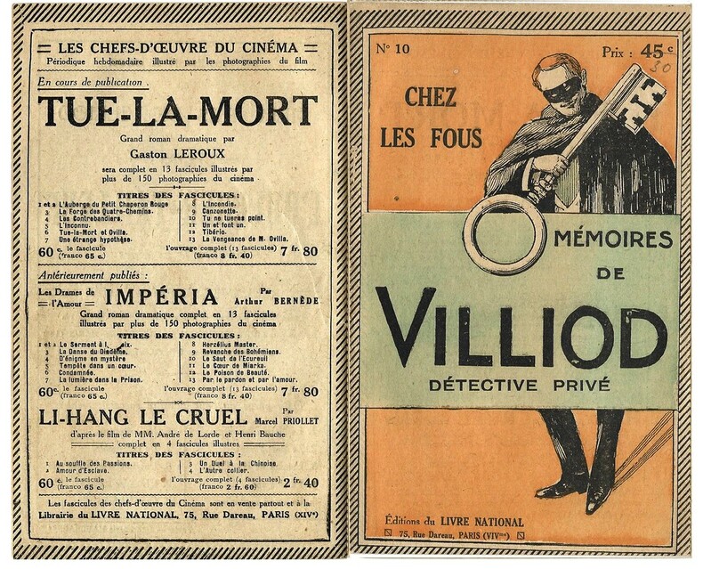 Editions du Livre National 1921. Petit in 12 broché de 28 pages au format 18 x 11 cm. Couverture illustrée de Leonetto Capiello. Dos carré muet. Plats et intérieur frais. Rarissime édition originale, surtout dans un tel état de fraicheur.Ancien agent de la Sûreté, Eugène Villiod commence modestement sa carrière en 1899 dans une officine spécialisée dans les affaires de divorce et de renseignements commerciaux.Eugène Villiod fut, comme il le prétend, un maître détective, mais sans doute faut-il lui reconnaître un prodigieux sens des affaires qui lui permit, en pionnier inventif, d’investir un marché de la sécurité en pleine expansion. Ses innombrables publications, l’essor et l’étonnante longévité de son agence, en font sans conteste le personnage phare du monde des détectives de la Belle Époque. Très vite, il passe à la vitesse supérieure, créant l’Agence policière privée, dont il se bombarde directeur. Il diversifie ses activités, ouvre des succursales à l’étranger, recourt massivement à la publicité et compose une imposante œuvre criminaliste, écrite. Aidé par très célèbre affiche de Leonetto Cappiello " L'Homme à la Clef ", il publie en 1921, une série de vingt fascicules, intitulés " Mémoires de Villiod, détective privé ", assurant ainsi son entrée dans la légende des détectives privés.
