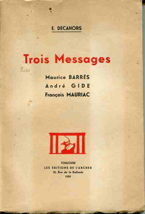 LES EDITIONS DE L'ARCHER. 1939. In-12. Broché. Etat d'usage, Couv. légèrement pliée, Coiffe en pied abîmée, Intérieur frais. 104 pages.. . . . Classification Dewey : 840-Littératures des langues romanes. Littérature française