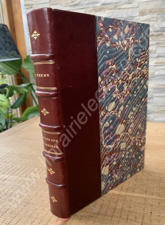 Paris Bibliothèque d'éducation et de récréation, J. Hetzel et Cie, ( sans date, fin du XIXème siècle ) 0 grand in 8 (26,5x19) 1 volume relié demi veau lisse vert olive de l'époque, dos à nerfs soulignés de pointillés dorés et de filets à froid, pièces de titre et de tomaison bleues, 412 pages, quelques rousseurs, (Les voyages extraordinaires). Bel exemplaire, reliure de l'époque très fraiche ( Photographies sur demande / We can send pictures of this book on simple request )
