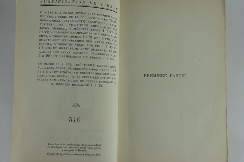 Paris, Bernard Grasset, Le Trentenaire, 1939, in-12, broché, 332 pages. Un des 990 ex. sur alfa. Dos creusé. Bon exemplaire. Intérieur frais.