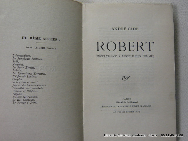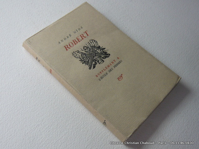 Paris, NRF, Gallimard, 1929-1930. In-12, demi chagrin à coins maroquiné, dos à nerfs, titres dorés, tranche supérieure dorée, 171 pp; 89 pp. Edition originale pour les deux ouvrages, tirage limité numéroté à 1901 exemplaires, celui-ci étant un des 547 sur Hollande Van Gelder sous couverture bleue, portant le numéro H. CCCXCIV (tirage pour "L'Ecole des femmes"); tirage limité numéroté à 1705 exemplaires, celui-ci étant un des 1035 sur vélin pur fil, portant le numéro 328 (tirage pour "Robert"). Couvertures et dos conservés pour les deux ouvrages. Exemplaire non rogné. Dos insolé, infimes rousseurs, papier légèrement jauni, couverture du premier ouvrage insolée.