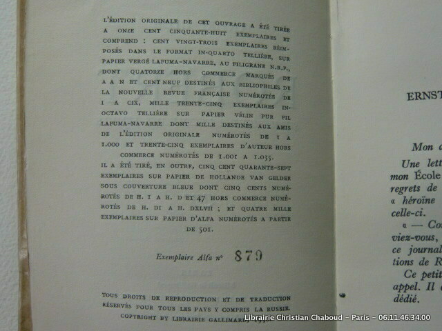 Paris, Librairie Gallimard, Editions de la Nouvelle Revue Française, 1930. Edition Originale. In-12 broché, 89 p. Exemplaire n° 327 / 1035 (/1158) sur vélin pur fil. Feuille volante : Errata. Très bon état.