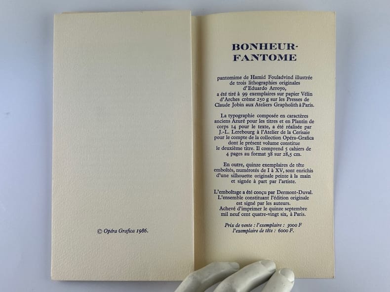 Paris, Galerie Louis Carré & Cie, 2003, Broché, 79 pages. Bon état. Ouvrage en français, espagnol et anglais. Importante biographie, liste d'expo. collectives, catalogues d'expo., et oeuvres d'E. Arroyo. JOINT "Bonheur-Fantôme", texte de Alain Jouffroy, Berggruen & Cie. Plaquette de présentation de l'ouvrage de Hamid Fouladvind, en 2 feuillets, avec portrait de l'auteur par Arroyo.