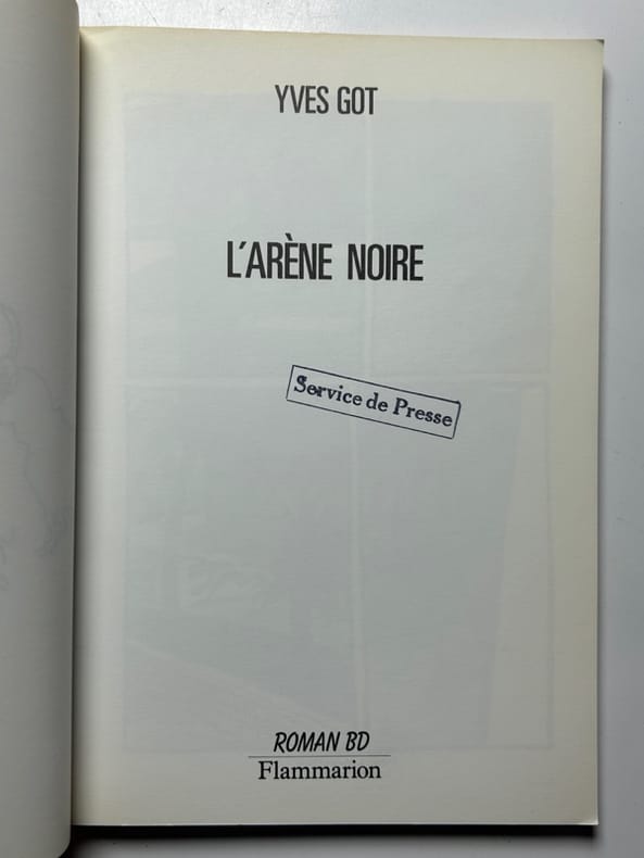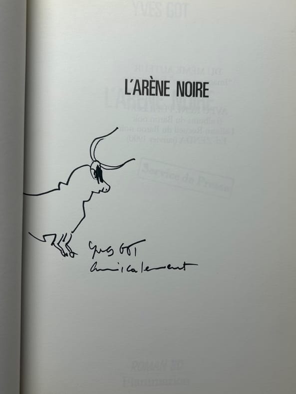Flammarion / Roman BD 1990. In-8 broché de 128 pages au format 15,5 x 23 cm. Couverture, textes et dessins de Yves Got. Roman graphique en noir et blanc se déroulant dans le monde de la Corrida. Exemplaire du service de presse, avec son prière d'insérer. Coins avec infimes frottis, sinon très bel état. Edition originale ornée d'un petit dessin original de Got ( non nominatif ).