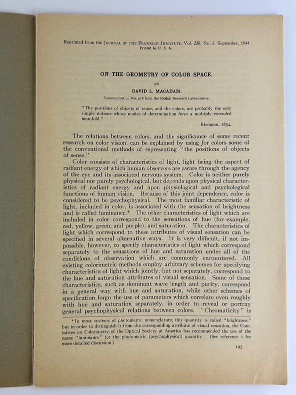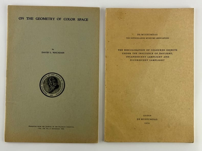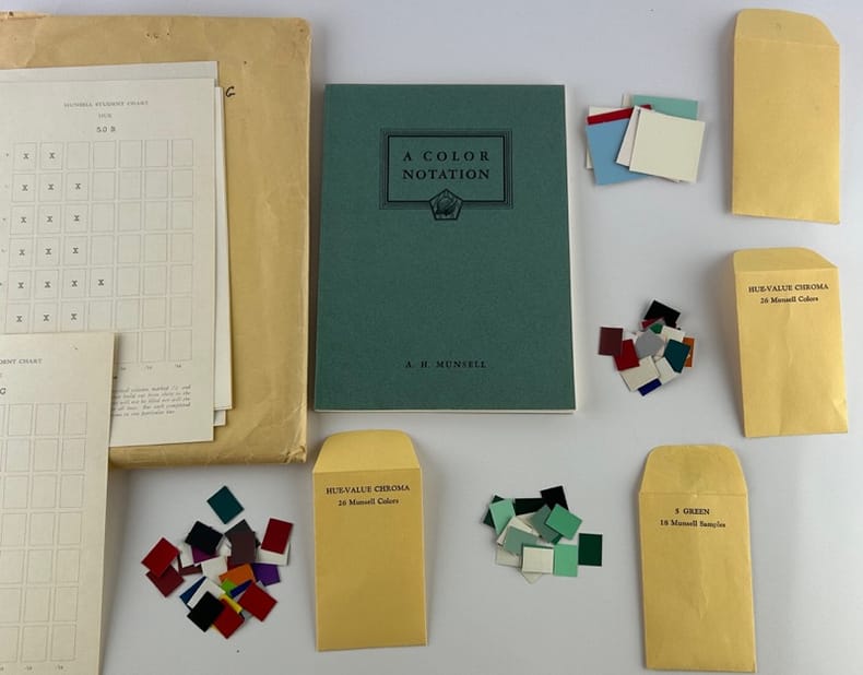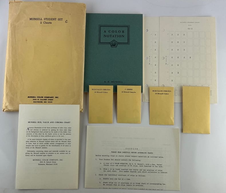 Baltimore Munsell Color Company, Inc? 1976,1961, in-8, broché, 67p. Complet des deux tableaux "valeur / chroma" et du fascicule "Mansell Hue, Value and Chroma Chart" avec 4 petites enveloppes contenant les échantillons de couleurs (2 x 26, 1x 18 et 8 carrés) à contrecoller dans les tableaux de teintes. ON JOINT 2 plaquettes : "On the geometery of color space", by David L. Macadam, reprinted from the Journal of the Franklin Institute, 1944 & "The discoloration of coloured objetcs under the influence of daylight, incandescent lamplight and fluorescent lamplight" byF.J. Balder - De Museumdag, Leiden, 1956.