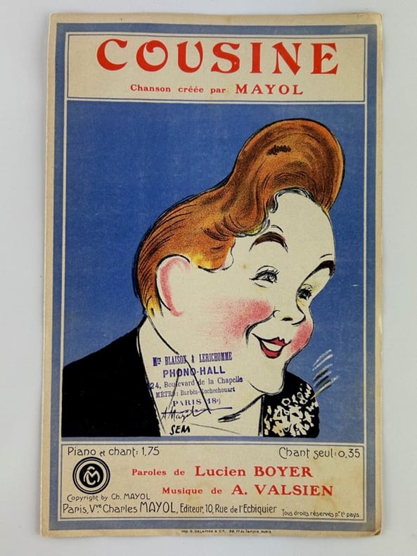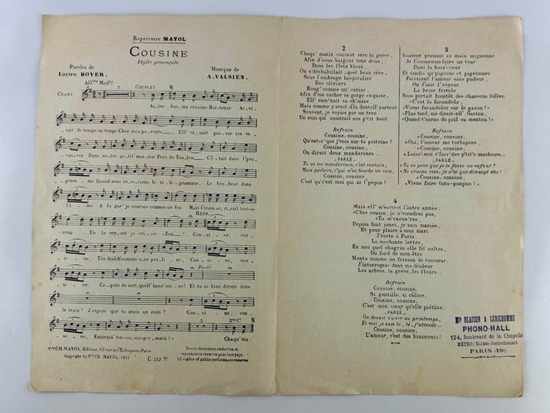Paris, Ch. Mayol 1964, 17,5 x 27 cm, en feuilles, 4p. Cachet "Phono-Hall" sur couverture. Bon état. Chanson polissonne (Viens faire tutu-panpan !) à la mode provençale :"Autrefois, ma cousine Hortense Arrivait de temps en temps Chez mes parents ; Elle venait passer ses vacances Dans notre petite maison Près de Toulon".