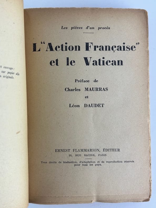 Le 29 décembre 1926, le quotidien L'Action française et sept ouvrages de Charles Maurras sont condamnés par le Saint-Office et mis à l'index... Cet ouvrage est le Livre Jaune de l'Action Française. C'est un fort volume de 319 pages, qui réunit avec les documents déjà connus, plusieurs documents qui, jusqu'à ce jour, n'avaient pas été publiés. "Nous venons de relire les épreuves de ce volume, simple recueil de textes, mais qui permettra à beaucoup d'entre vous de pe rendre compte de bien des choses ! Feuille à feuille, nous y voyons, quand à nous, non seulement pourquoi vous êtes restés fidèles à l'Action Française, mais pourquoi un si grand nombre d'entre vous nous a rejoints à la suite des assauts qui nous étaient livrés. Plus encore que les sentiments d'une amitié tenace, c'est le patriotisme, c'est l'amour de la vérité qui vous ont ainsi conservés ou ralliés à notre oeuvre, a notre pensée et à notre action. Assurément, le débat aura été douloureux pour tous. Les catholiques étaient les mieux placés pour en souffrir dans leurs coeurs troublés, dans leurs esprits quelquefois remués jusqu'au fond ! Mais, eux aussi, les incroyants, de tout temps si émus des splendeurs du bienfait de Rome, si confiants dans l'immense service quelle rend à l'esprit humain et au genre humain, auront senti quelque chose se déchirer en eux devant les proportions de l'erreur commise et les cruelles conséquences qu'elle leur semblait contenir. (...) De toute évidence, l'Action Française était innocente. De toute évidence, elle était victime de mille erreurs de fait. Néanmoins nous avons voulu accorder à la discipline catholique tout ce qu'elle pouvait demander..." (préface)