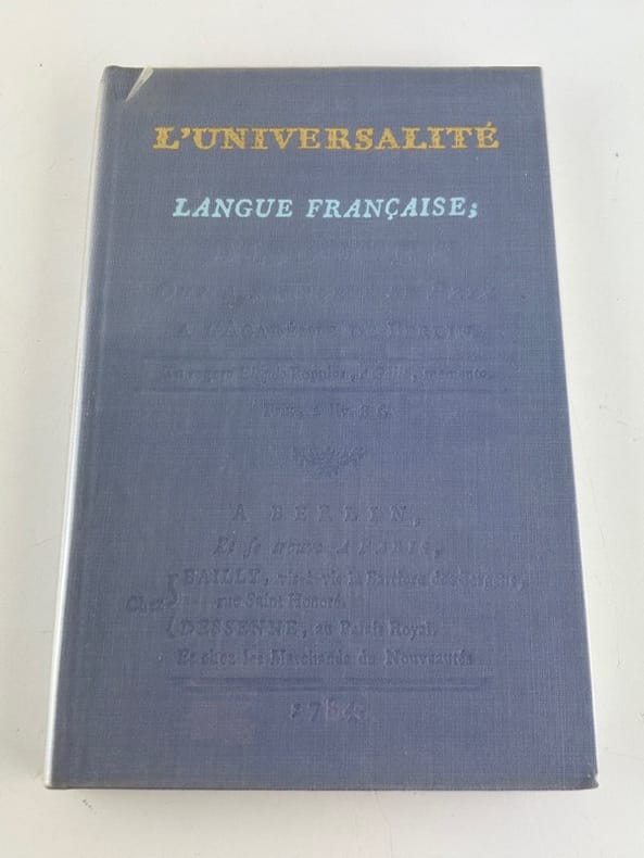 Deuxième édition. « Rien n'est comparable à la prose française : cette forte affirmation résume le message de ce petit ouvrage écrit tout entier à la gloire de la France et de la langue française. (…) Rivarol n'a pas assez de mots pour louer l'ordre, la construction, la clarté de la phrase française, de la prose française. C'est là qu'il lance sa plus célèbre formule : Ce qui n'est pas clair n'est pas français » (En français dans le texte, 177). Petit accident aux coiffes.