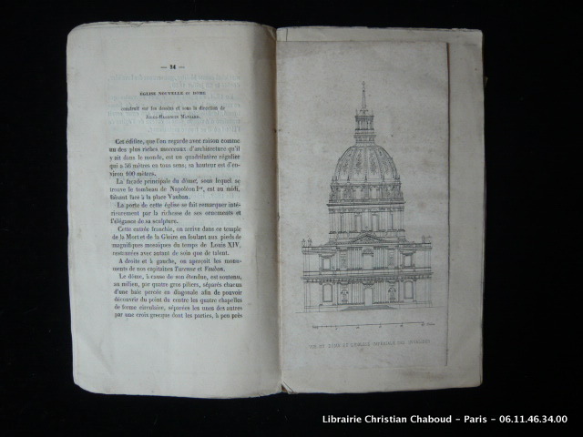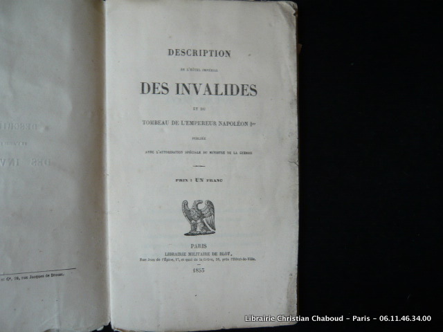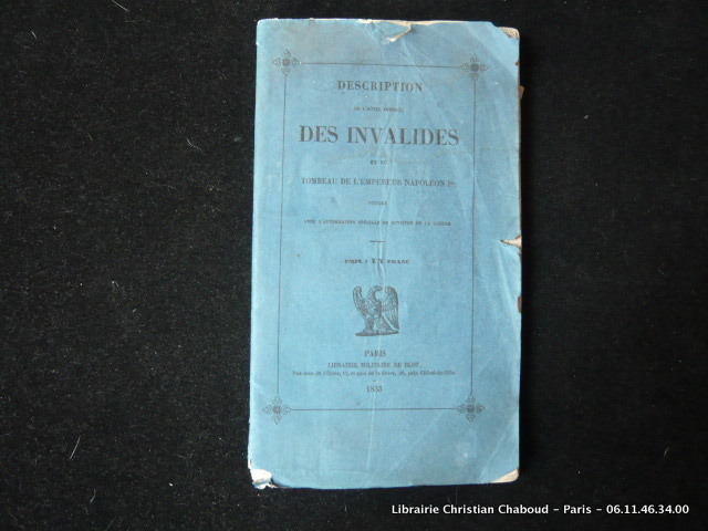 Paris, Librairie Militaire de Blot, 1853, in-8, broché, 95 pages. E.O. 2 planches h.-t. ( I-grande façade de l'Hôtel Impérial des Invalides & vue perspective de la Cour Impériale des Invalides; II-Vue du Dôme) Couverture bleue nuit frappée de l'aigle impérial. Petits manques sur les plats. Bon état intérieur. Solide exemplaire.