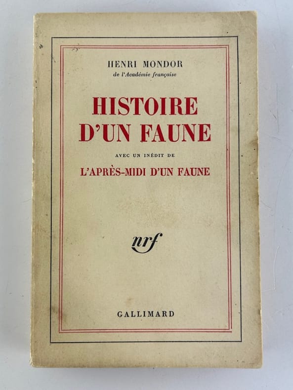 Paris Gallimard 1948 1 vol. broché in-12, broché, non coupé, 244 pp., 3 planches hors-texte. Edition originale en service de presse avec un envoi de l'auteur "Pour Monsieur Georges Bataille que j'admire beaucoup, cette [Histoire d'un faune] et les meilleurs compliments. H. Mondor". Important manque de papier au dos et rousseurs à la couverture. Prière d'insérer joint.