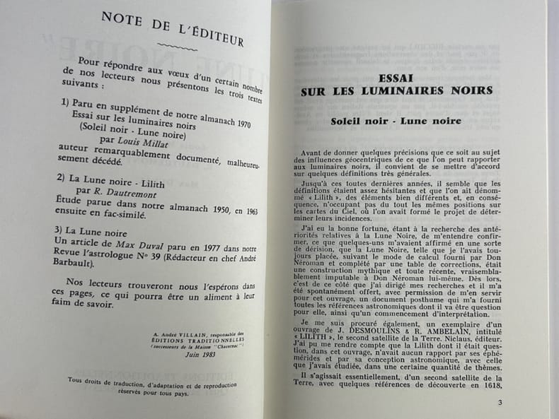 quelques figures dans le texte en noir et blanc 1ere édition Contents, Chapitres : Introduction - Lune et Lune noire en astrologie - Lune noire et mythologie - Le meurtre - Correspondance avec la psychanalyse - L'amour au fil du rasoir - La Lune noire et les 12 secteurs - Une uvre lune noire - Dissidences et absences - Les homosexualités - L'impénétrable Lilith et les sociétés secrètes - La mort physique - Crimes et sévices sexuels - La mort naturelle - Morts et légendes - Du côté de Priape - Conclusion, les acteurs, annexe : Les tables de la Lune - Bibliographie infimes traces de pliure aux coins de la couverture, couverture legerement jaunie sans gravité, sinon intérieur frais et propre, exemplaire augmenté d'un envoi autographe signé de Jacqueline Aimé