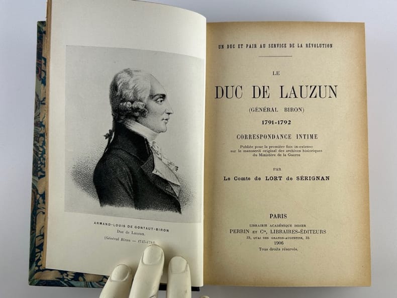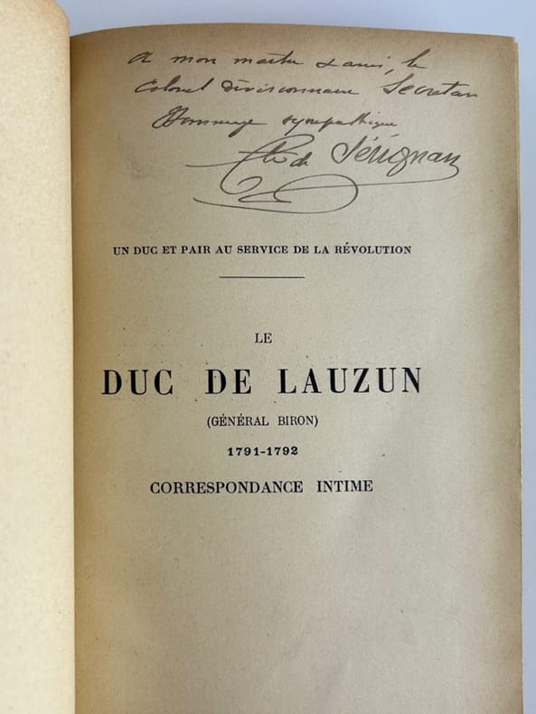 Paris, Librairie Académique Didier. Perrin & Cie, Un duc et pair au service de la révolution, 1906, in-8, demi-reliure, 329 pages. Envoi autographe signé de Lort de Sérignan au colonel divisionnaire Édouard Secrétan. Bon état. Texte frais. Portrait d'Armand-Louis de Contaut-Biron en frontispice.