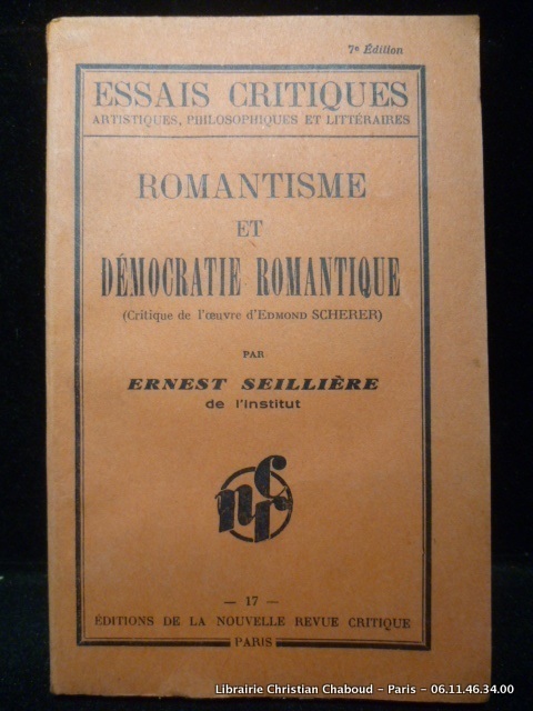 P., NRC (Collection "Essais Critiques"), 1930, in 12 broché, 249 pages ; index in-fine ; couverture fanée.