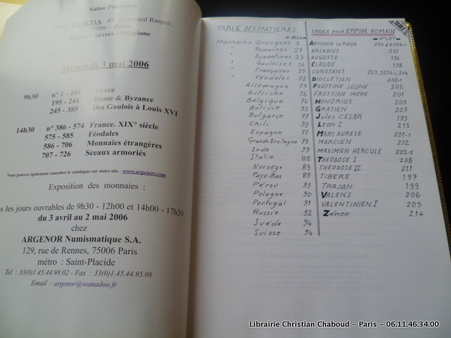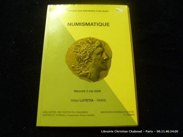 Paris, Argenor Numismatique S.A., in-4, Broché., Vente aux enchères publiques. Numismatique. Mercredi 3 mai 2006 Hôtel Lutetia. Exemplaire (provenant de la bibliothèque d'un graphiste) enrichi de documents contrecollés augmentant la valeur documentaire de l'ouvrage. Mise en page des ajouts très soignée. Bon état.