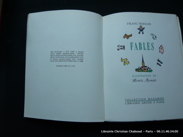 Paris, Librairie Gründ - Coll. Mazarine, 1945, in-4, broché sous couverture rempliée, 144 pages. Un des 200 exemplaire sur Vélin de Rives numérotés I à CC. (CVII) Suivent 1000 ex. sur chiffon. Nombreuses illustrations de H. Monier coloriés à la main par les Etablissements Le Coloris à Paris. 4° plat présentant une légère insolation. Intérieur de toute fraîcheur. Bon exemplaire.