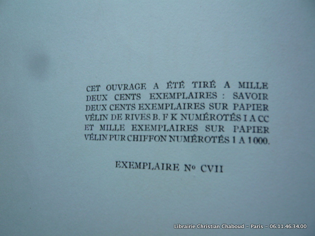 La Librairie Christian Chaboud vous propose un vaste choix de livres anciens et modernes. Les ouvrages peuvent être consultés et retirés sur rendez-vous à Bruxelles ou à Paris (5e arr.); prévoir quelques jours de délai. Merci de nous contacter. Le prix indiqué ne comprend pas les frais de port qui vous seront communiqués par mail ou téléphone. Les envois vers la France se font au tarif de la poste française. L'envoi des ouvrages se fait à réception de paiement. Tout renseignement peut être demandé par messagerie et téléphone. Le paiement est possible par carte, virement bancaire, Paypal et espèces. Le livre est réservé pendant 8 jours après confirmation de sa disponibilité.