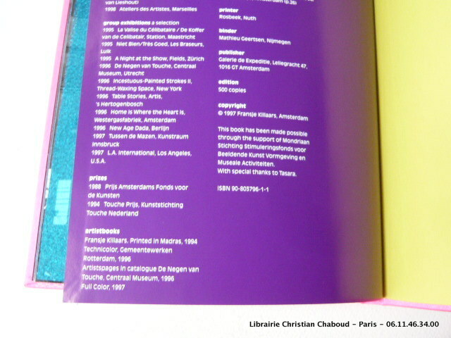 Amsterdam Fransje Killaars 1997 1 vol. relié gr. in-8, toile éditeur de soie rose fluorescente, non paginé. Beau catalogue conçu par l'artiste, alternance de photographies couleurs de différentes installations (sur papier surbrillant) avec des feuillets en mousseline, tulle et voilages. Présentation en anglais et en néerlandais par Lex ter Braak. Tirage limité à 500 exemplaires. Très bonne condition.