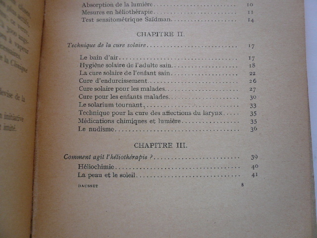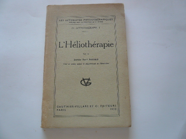 14 planches de photographies en noir et blanc en fin d'ouvrage, quelques figures dans le texte 2eme édition, 1921 Contents, Chapitres : Préface : Une école de plein air pendant la guerre (Ecole du soleil de Monnetier) - Le rôle du plein air et du soleil dans la lutte contre la tuberculose de l'enfant - Les principes essentiels de l'école au soleil - Une expérience d'école au soleil au Monnetier - L'héliothérapie préventive à l'école-sanatorium et au préventarium - Les règles de l'entrainement à l'exposition solaire - Les résultats physiologiques - Valeur prophylactique antituberculeuse de la cure solaire - Bibliographie sur l'héliothérapie (1 page) - NB : Le docteur Paul-Félix Armand-Delille, 1874-1963, est un des précurseurs de l'héliothérapie et des cures solaires infimes déchirures sans manques aux extrémités du dos, bords de la couverture un peu brunis, avec de legeres traces de pliures sans gravité, quelques rousseurs sur les plats, l'intérieur est sinon propre, papier un peu jauni, tres legere pliure sur le bord droit des pages, cela reste un bon exemplaire