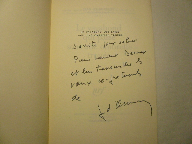 Gallimard Paris 1978. E.O. en S.P. Envoi autographe signé « [LE VAGABOND QUI PASSE SOUS UNE OMBRELLE TROUEE] s’abrite pour saluer Pol Vandromme et lui transmettre les vœux chaleureux de J. d’Ormesson ». Broché in-8, très bel état général
