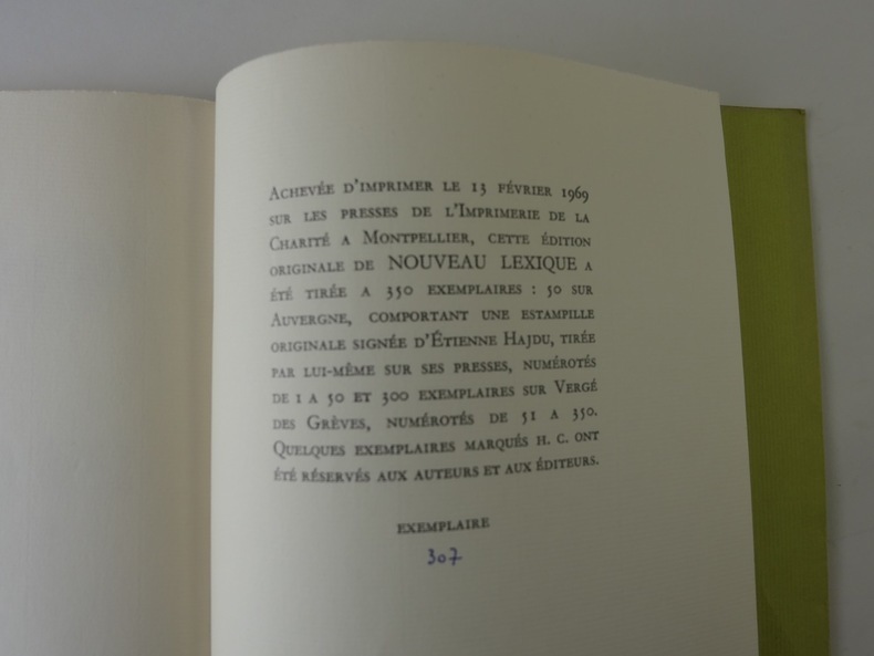 édition originale. Tirage limité à 350 exemplaires numérotés. Celui-ci, l’un des 50 du tirage de tête sur Auvergne, comportant l’estampille originale d’étienne Hajdu, justifiée et signée par l’artiste. Très bon état d’occasion
