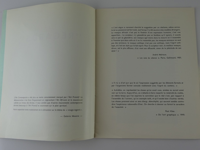 Paris, Musée de la Culture de Bourges, 1971, in-4, broché, np Bon état. "L'Art Contemporain a été plus ou moins consciemment marqué par l'Art Primitif. La démonstration s'est faite en rapprochant l'Art Africain et le mouvement cubiste au niveau des formes. Il nous semble que d'autres mouvements contemporains doivent beaucoup à l'Art Primitif et notamment sur la plan spirituel. Notre exposition tente modestement de le démontrer sur le thème du visage". Galerie Messine.