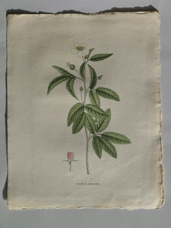 Paris, Chez l'auteur, 1819-1822, Planche non rognée sur vélin imprimée en couleurs d'après les dessins de Jaume Saint Hilaire et gravée au pointillé par Dubreuil et Veron. Gravure en couleurs sur cuivre au format 21x27cm. De toute fraîcheur.