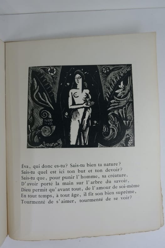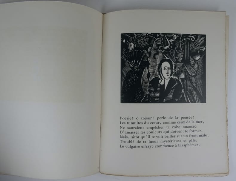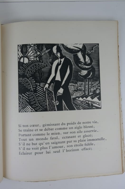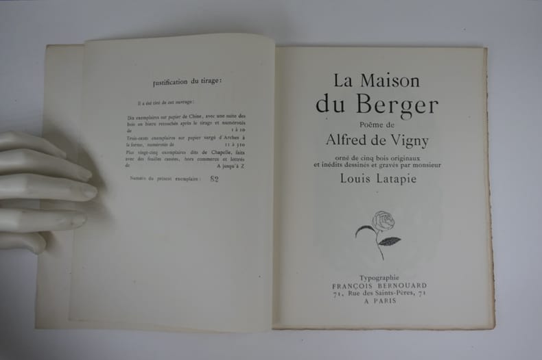 Paris, François Bernouard, Paris, François Bernouard12 sept. 1920 ; in-4, broché. Superbe édition typographique de François Bernouard.5 bois originaux du peintre graveur Louis LATAPIE. Né à Toulouse en 1891, Latapie fut l’élève des Beaux-Arts, de l’Académie Julian et de l’Académie Ranson. Mobilisé pendant toute la guerre de 14, il expose ses premières oeuvres après la guerre dans divers salons et galeries parisiennes. Il était lié à Braque et à Bissière. “Je voulais faire un cubisme chaud, à température plus élevée... ajouter à la rigueur de la construction des cubistes le lyrisme qui tord les formes et exalte la couleur”. Extrait du Journal inédit, cité par Osterwalder p. 986 - Fonds Français XII p. 472 - Dassonville p. 28. C’est la première contribution de ce peintre à un livre illustré.Tirage limité à 335 exemplaires. Un des 300 sur vergé d’Arches (n°166), en parfait état de fraîcheur.