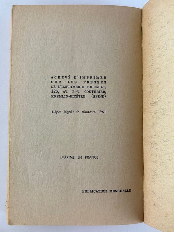 Paris Fleuve Noir, Espionnage, n°286, 2 trimestre 1961, in-12, broché, 222p. Edition originale. Couverture de Gourdon. Pliures sur la couverture. Nom de l'ancien propriétaire sur la garde blanche.