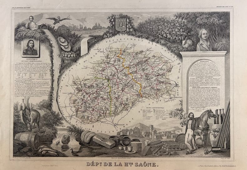 Paris, A. COMBETTE, 1856, 41x27,5 (image) 45x32cm,, La carte est illustrée en encadrement de scènes ayant trait au département, de portraits, de personnalités ainsi que de renseignements statistiques, culturels, historiques et économiques. Les coloris soulignent les limites du département, des arrondissements et des cantons. Carte telle que parue, sans pliure centrale, complète de toutes ses marges, provenant de l' Atlas National Illustré des 86 Départements et des Possessions de la France Divisé par Arrondissements, Cantons et Communes avec le tracé de toutes les routes, chemins de fer et canaux. Dressée par Levasseur d'après les Travaux du Cadastre du Dépôt de la guerre et des Ponts et Chaussées.