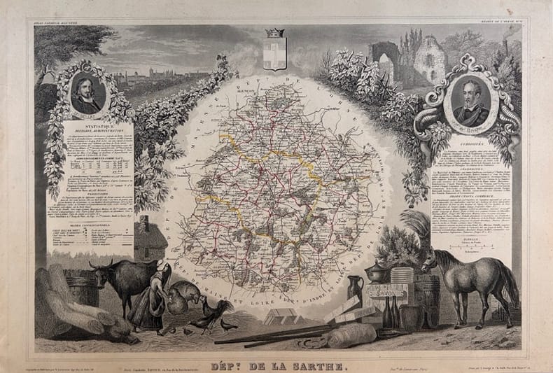 Paris, A. COMBETTE, 1856, 41x27,5 (image) 45x32cm,, La carte est illustrée en encadrement de scènes ayant trait au département, de portraits, de personnalités ainsi que de renseignements statistiques, culturels, historiques et économiques. Les coloris soulignent les limites du département, des arrondissements et des cantons. Carte telle que parue, sans pliure centrale, complète de toutes ses marges, provenant de l' Atlas National Illustré des 86 Départements et des Possessions de la France Divisé par Arrondissements, Cantons et Communes avec le tracé de toutes les routes, chemins de fer et canaux. Dressée par Levasseur d'après les Travaux du Cadastre du Dépôt de la guerre et des Ponts et Chaussées.