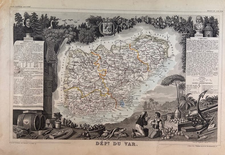 Paris, A. COMBETTE, 1856, 41x27,5 (image) 45x32cm,, La carte est illustrée en encadrement de scènes ayant trait au département, de portraits, de personnalités ainsi que de renseignements statistiques, culturels, historiques et économiques. Les coloris soulignent les limites du département, des arrondissements et des cantons. Carte telle que parue, sans pliure centrale, complète de toutes ses marges, provenant de l' Atlas National Illustré des 86 Départements et des Possessions de la France Divisé par Arrondissements, Cantons et Communes avec le tracé de toutes les routes, chemins de fer et canaux. Dressée par Levasseur d'après les Travaux du Cadastre du Dépôt de la guerre et des Ponts et Chaussées.