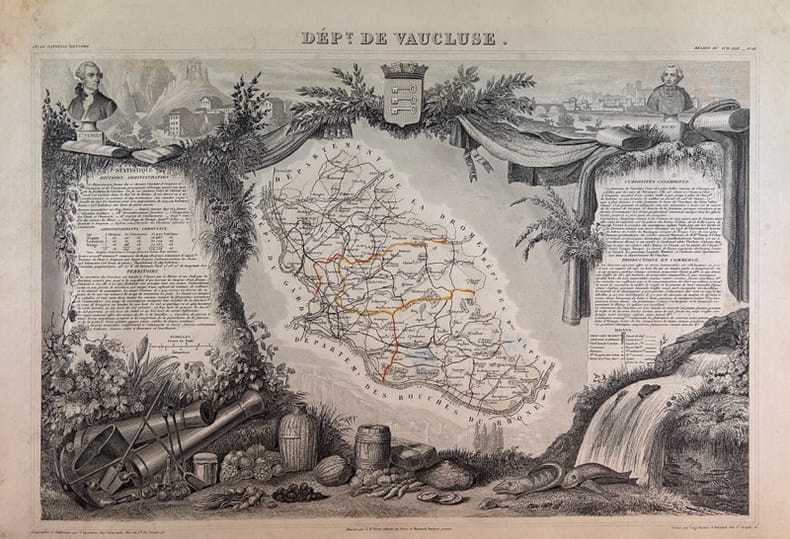 Paris, A. COMBETTE, 1856, 41x27,5 (image) 45x32cm,, La carte est illustrée en encadrement de scènes ayant trait au département, de portraits, de personnalités ainsi que de renseignements statistiques, culturels, historiques et économiques. Les coloris soulignent les limites du département, des arrondissements et des cantons. Carte telle que parue, sans pliure centrale, complète de toutes ses marges, provenant de l' Atlas National Illustré des 86 Départements et des Possessions de la France Divisé par Arrondissements, Cantons et Communes avec le tracé de toutes les routes, chemins de fer et canaux. Dressée par Levasseur d'après les Travaux du Cadastre du Dépôt de la guerre et des Ponts et Chaussées.