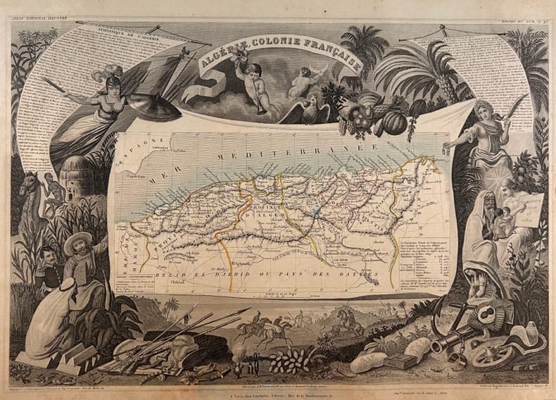Paris, A. COMBETTE, 1856, 41x27,5 (image) 45x32cm,, La carte est illustrée en encadrement de scènes ayant trait au département, de portraits, de personnalités ainsi que de renseignements statistiques, culturels, historiques et économiques. Les coloris soulignent les limites du département, des arrondissements et des cantons. Carte telle que parue, sans pliure centrale, complète de toutes ses marges, provenant de l' Atlas National Illustré des 86 Départements et des Possessions de la France Divisé par Arrondissements, Cantons et Communes avec le tracé de toutes les routes, chemins de fer et canaux. Dressée par Levasseur d'après les Travaux du Cadastre du Dépôt de la guerre et des Ponts et Chaussées.