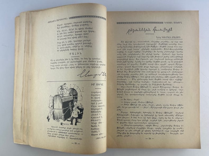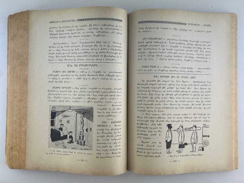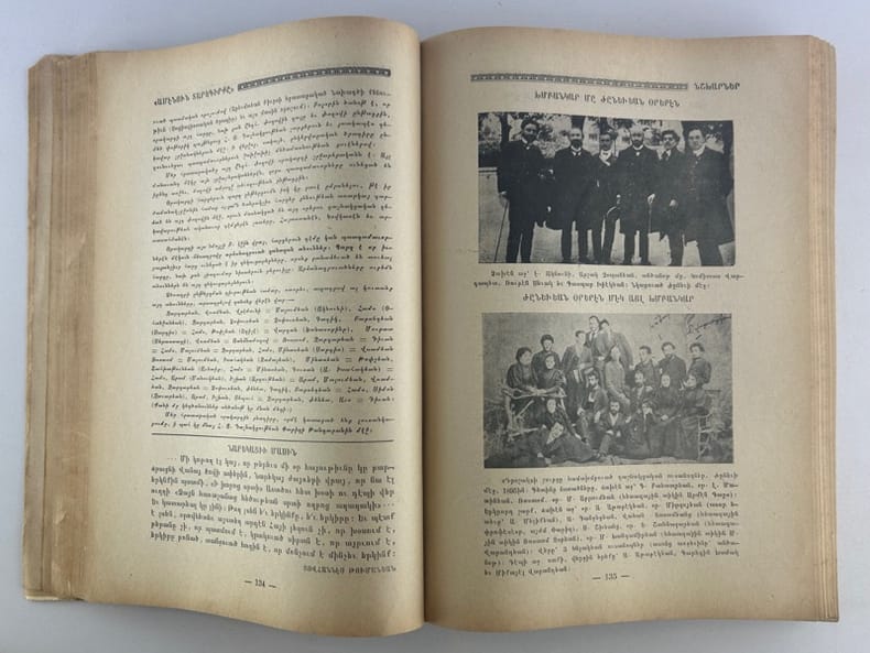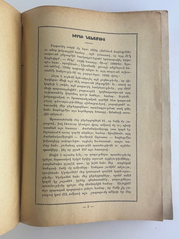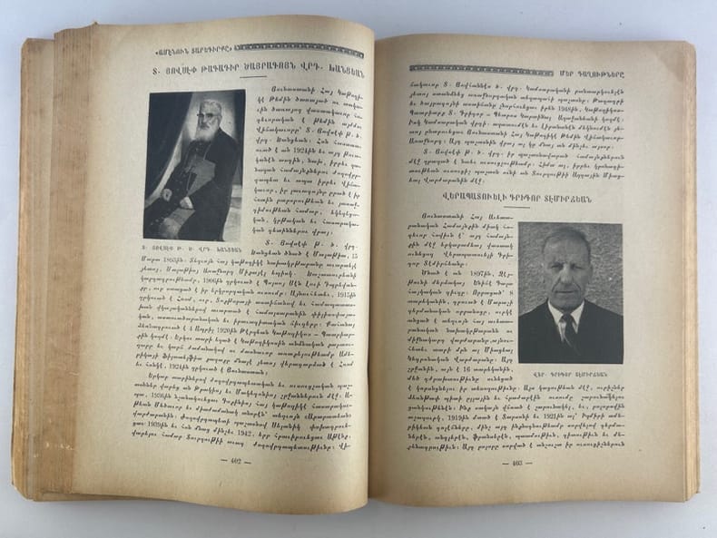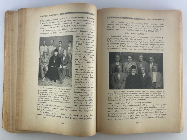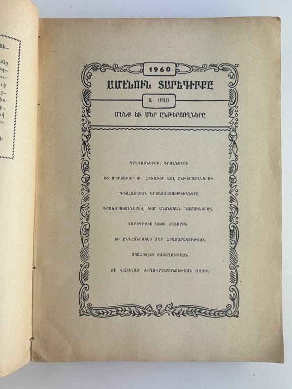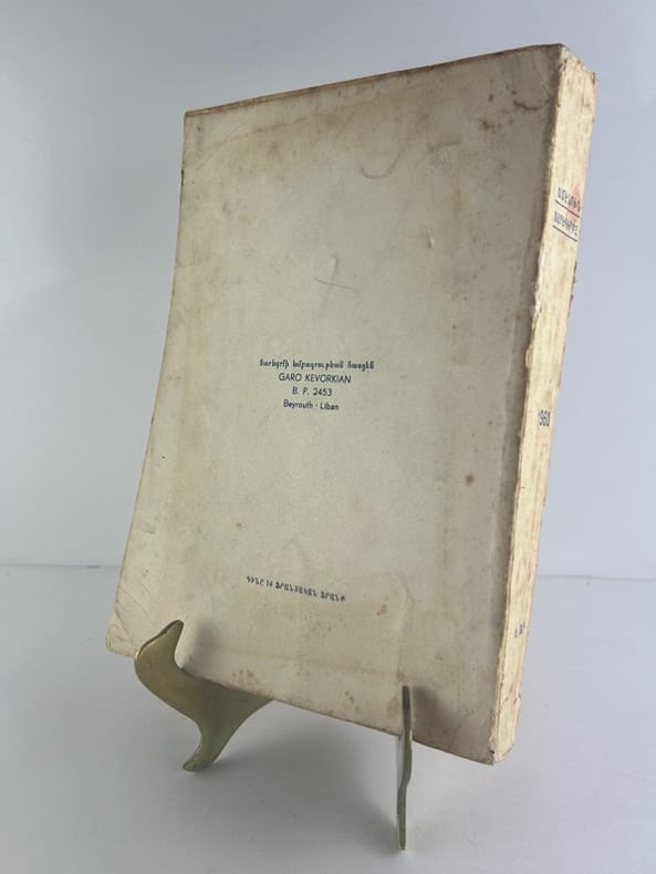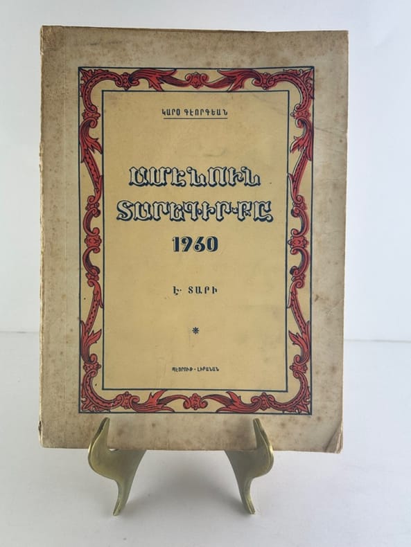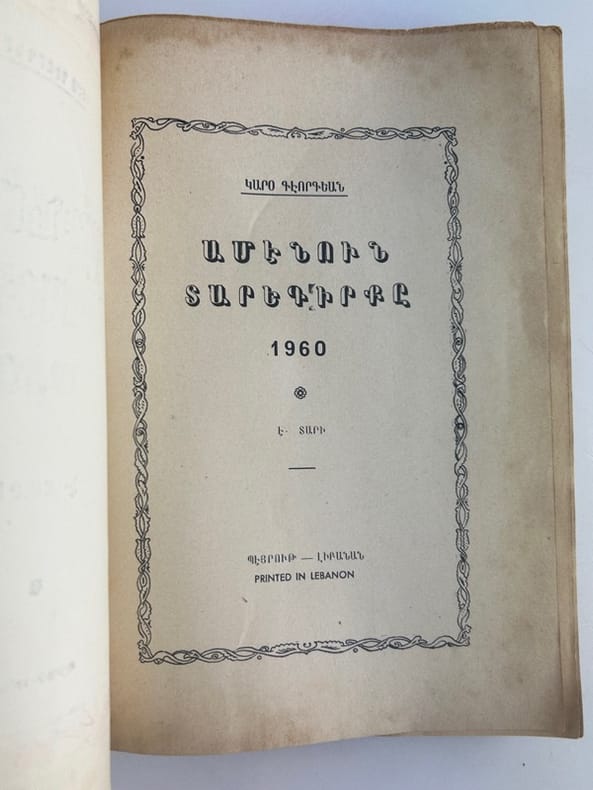 Beyrouth, 1960, in-8, broché, 648p. Ecrit et publié par Garo Kévorkian cet annuaire commence à paraître au Liban en 1954 jusqu’en 1968. Ces ouvrages (14 volumes) sont des sources très précieuses sur les événements et les personnalités des différentes colonies arméniennes installées en diaspora, après le génocide de 1915 perpétré dans l’Empire ottoman par le gouvernement « Jeunes-Turcs ».Véritable travail sur la mémoire arménienne, « Amenoun Darekirke » est un annuaire social, politique et culturel. On y retrouve différents thèmes comme la littérature, les événements historiques, ethnographiques, le monde religieux, le sport… De nombreuses personnalités arméniennes (artistes, politiques…) y sont présentées avec de précieuses biographies. L’auteur évoque aussi les colonies arméniennes du Liban, de Syrie, d’Egypte, d’Irak, d’Iran, de Chypre, d’Inde, d’Italie, de Grande Bretagne, d’Autriche, des Etats-Unis et de France et comporte de nombreuses photographies et quantités d’informations. (source Webaram).