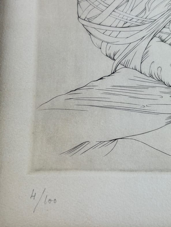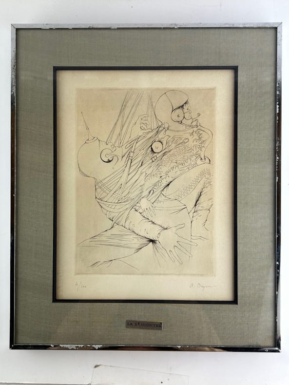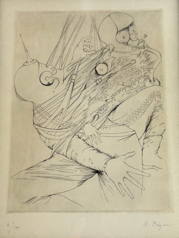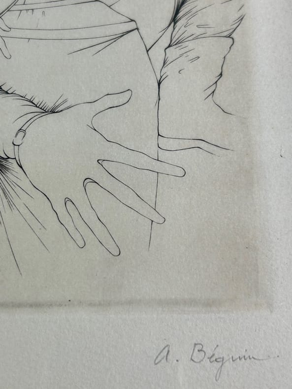 Paris 1977 22x29 cm et 33,5x40,5 cm avec cadre, A. Béguin est graveur, éditeur, imprimeur, dessinateur, romancier et historien des techniques de l'estampe français, auteur du Dictionnaire technique de l'estampe (1977). Il était membre du Comité national de l’estampe, et fut pendant un temps président de l’association La Jeune gravure contemporaine.