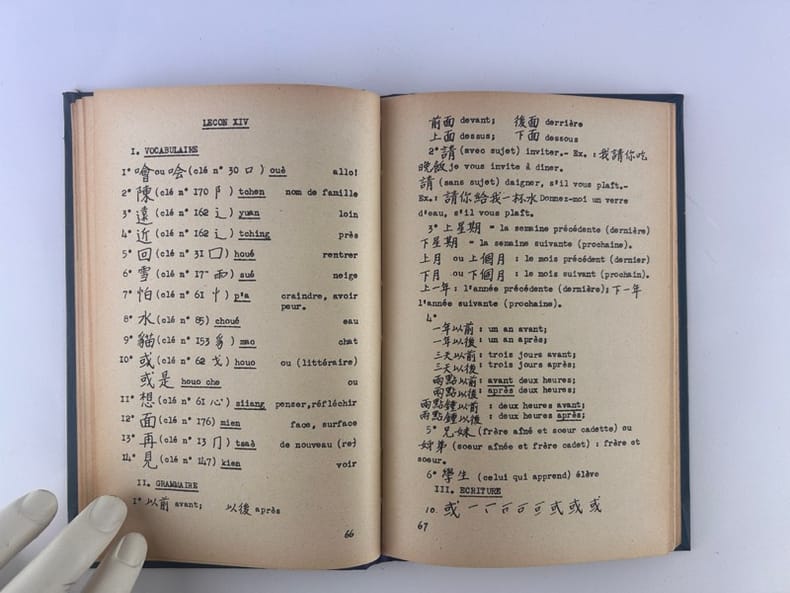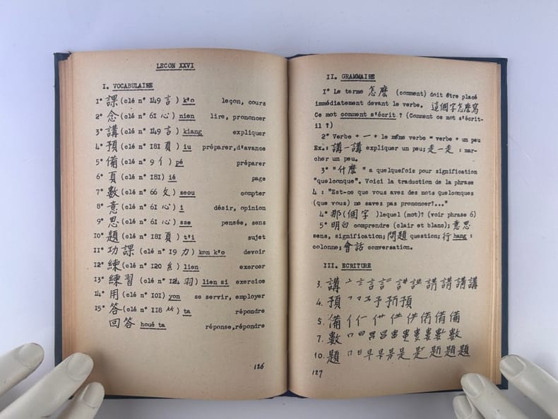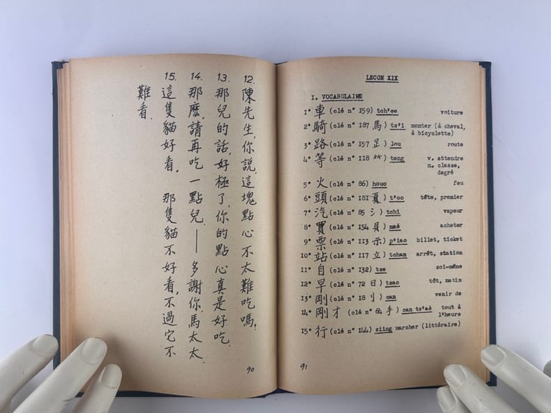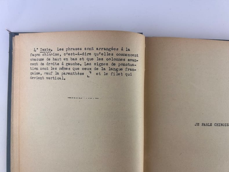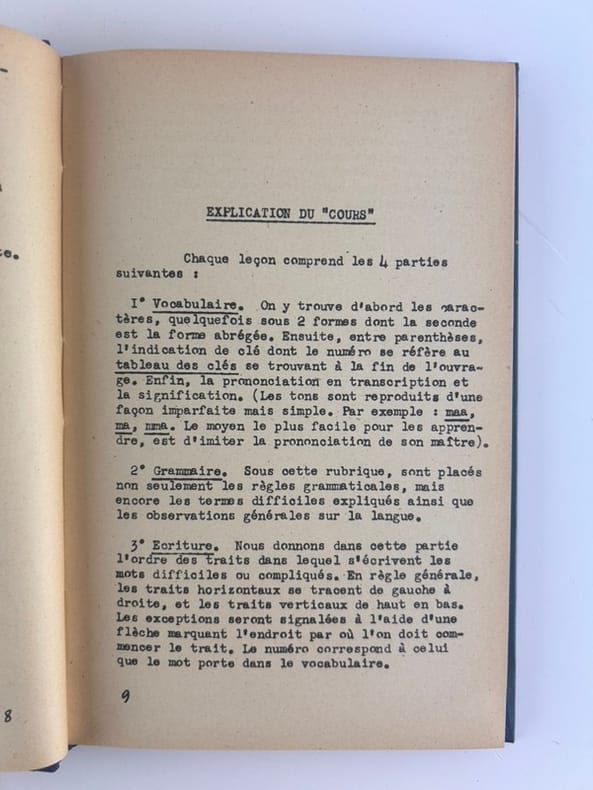Édition originale, par le Comte Kleczkowsky, Consul général de France, ministre plénipotentiaire, Premier secrétaire interprète du gouverneur pour les langues de la Chine, professeur de chinois vulgaire à l'École nationale des Langues orientales vivantes, permettant une approche plus terre à terre du chinois au moment où, après l’ouverture forcée au commerce de la Chine, le besoin de sinologues se faisait sentir. "Tous les élèves formés par ses soins provoquaient, à leur arrivée dans l'Extrême-Orient, l'étonnement des Chinois et des Européens par la solidité de leurs connaissances et par la facilité et la pureté de leur élocution." (Charles Schefer). M8-B