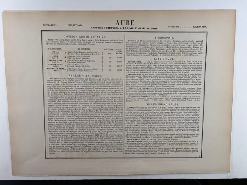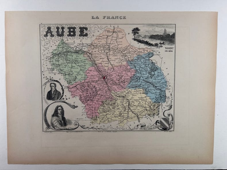Paris J. Migeon, Libraire -Editeur, Carte ancienne de toute fraîcheur gravée sur acier, imprimée sur papier fort et accompagnée de sa notice historique, biographique, statistique, etc.. sur une feuille distincte. Format de la carte, marges comprises : 26x35cm.