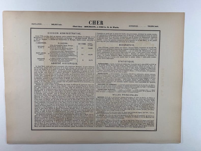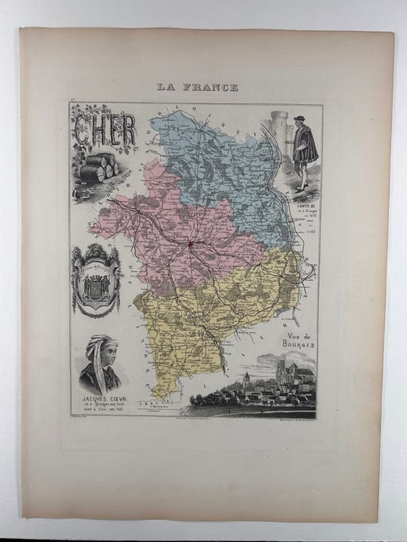 Paris J. Migeon, Libraire -Editeur, Carte ancienne de toute fraîcheur gravée sur acier, imprimée sur papier fort et accompagnée de sa notice historique, biographique, statistique, etc.. sur une feuille distincte. Format de la carte, marges comprises : 26x35cm.